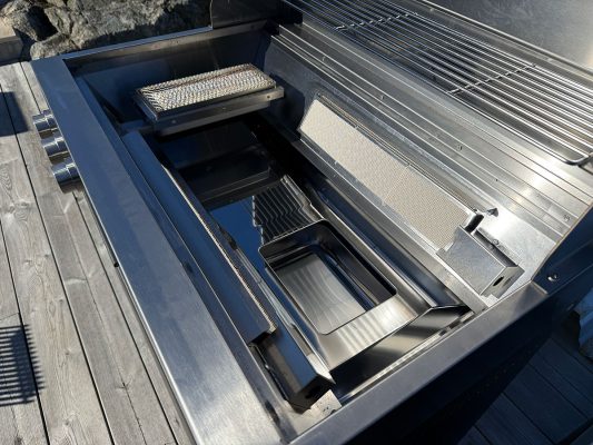 ”Kistan är en central del av grillen, och här har Bluegaz valt en lite annan väg. Två brännare sitter i fram- och bakkant, medan sizzle-burnern ligger på vänster sida. Det är en ovanlig uppbyggnad jämfört med vad jag är van vid – men det funkar klockrent.”