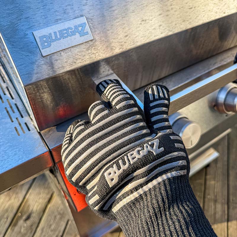 Grilla säkert utan att bränna dig med Bluegaz grillvantar! Dessa sköna grillvantar tål höga temperaturer och har silikoninlägg för ett säkert grepp.
