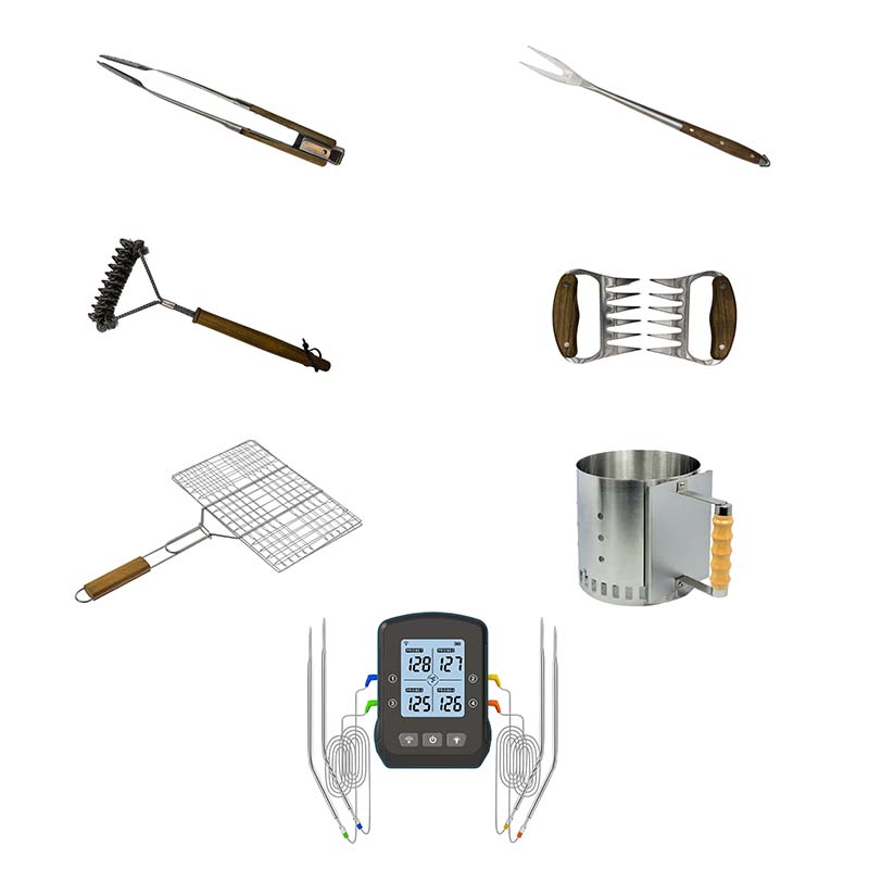 Detta grillpaket innehåller allt du behöver för att ta din grillning och rökning till nästa nivå! Paketet innehåller bland annat en grillkol starter för att snabbt få igång glöden och en trådlös grilltermometer med fyra sonder som låt dig bevaka innertemperaturen på upp till fyra köttstycken på samma gång. Grillhalstret gör det enkelt att grilla fisk och grönsaker utan att de fastnar, och med köttklorna kan du smidigt dra isär saftig pulled pork. För att hantera maten med precision ingår en robust grilltång och grillgaffel, och den medföljande grillgallerborsten ser till att grillen hålls ren och redo för nästa omgång. Med detta kolgrillspaket sparar du både tid och pengar eftersom du kan köpa alla produkter på en gång till nedsatt pris. Det är också perfekt som present till bbq-mästaren!