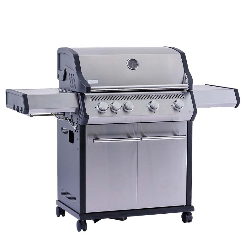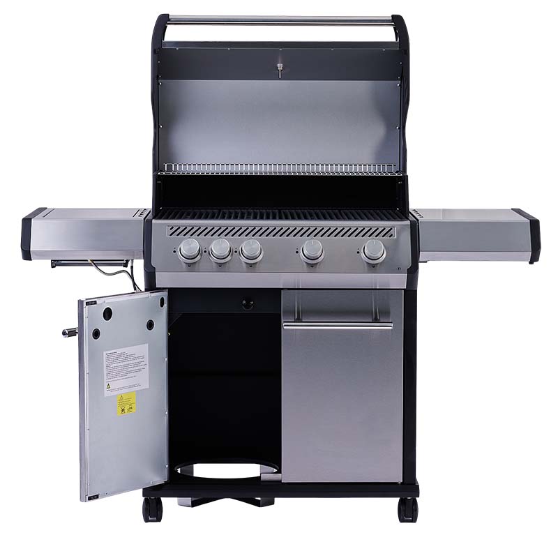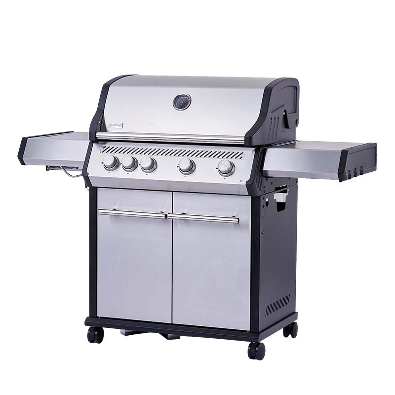 X1 är utrustad med två praktiska sidobord som ger generös arbetsyta för att förbereda ingredienser och servera mat. Under grillen finns ett rymligt skåp där gasolflaskan och grilltillbehör kan förvaras smidigt, och på insidan av den högra dörren sitter en smart korg för småsaker. Grillen har dessutom sex redskapskrokar som gör det enkelt att hålla grillverktygen nära till hands, och tack vare de fyra stadiga hjulen kan grillen enkelt flyttas dit du vill ha den.